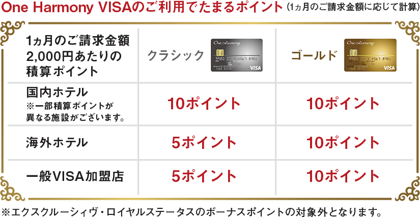 One Harmony VISAでたまるポイントは、One Harmonyステータスの判定対象ポイントです。また、ゴールドカードの会員の方は、会員期間中はOne Harmonyロイヤルメンバーとなります。