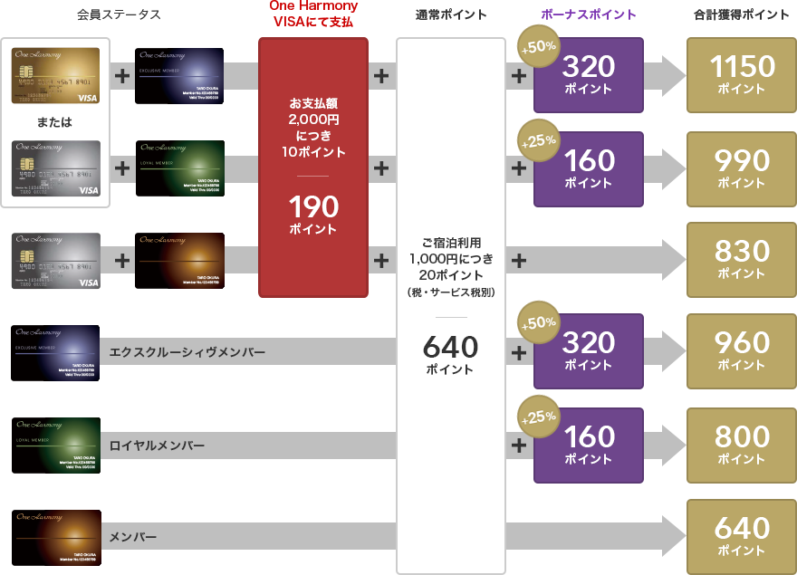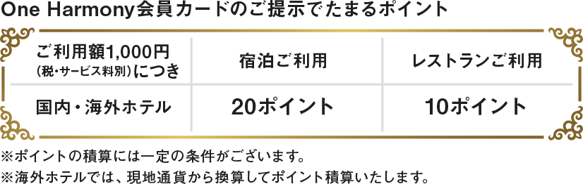 ホテルをご利用いただいた際には、通常のOne Harmonyポイントも積算されますので、お得にためることができます。