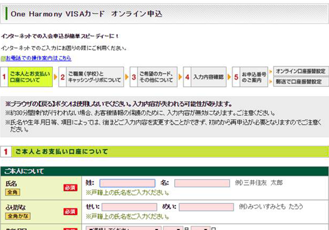 ホテル備え付けのOne Harmony VISA申込書にクレジットカード申し込み必要な内容を記入します。