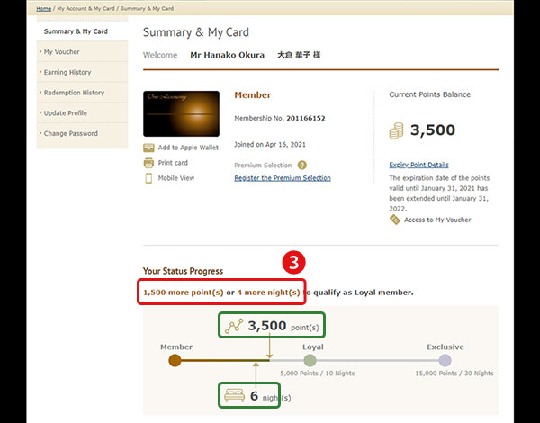 ■ You will be able to see the current status of nights and points you have