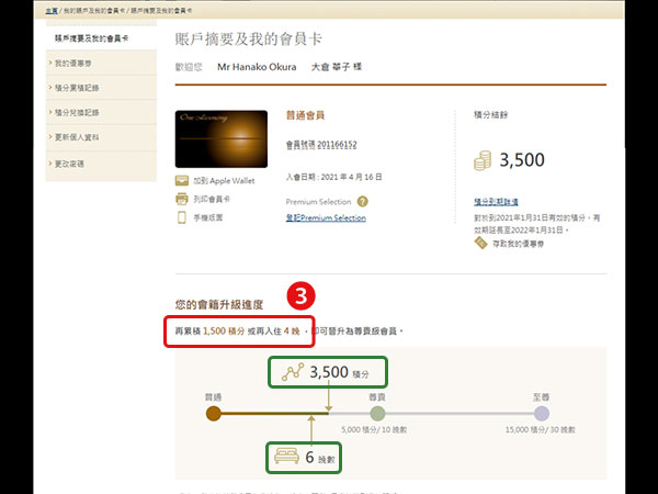 ❸ 登陸後,會顯示升級為下一級別會員所需的住宿晚數和積分數。