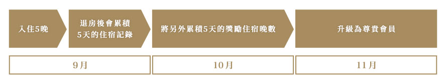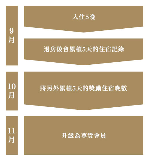 ※ 如果是在12月入住,獎勵住宿晚數將在次年1月累積,也將在同一月份升級為尊貴會員。